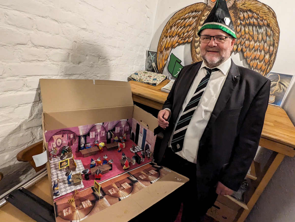 Jk Klaus beeindruckte mit seiner Trickfilm-Sippung die Sassen und zeigte im Anschluss stolz sein „Filmstudio“Jk Ludwig erläuterte die Elemente von Spiegel & Ceremoniale und montierte daraus den „Sesshaften“.Dann mußten die beiden noch das hochnotpeinliche Junkerexamen bestehen. Gut, dass sie den Schulrat gut vorbereitet hatten …Die Gladebachen waren hoch erfreut ob der kreativen Ritterarbeiten und der Fungierende fand die richtigen Worte des Lobes und der Vorfreude auf den baldigen Zuwachs an der Rittertafel.