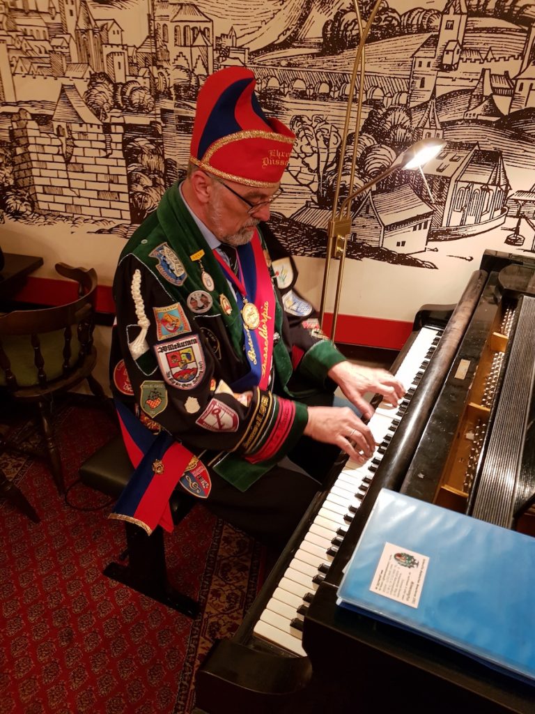 Der frischgebackende Ehrenritter Minnesangtus bei der „Sitzprobe“ am Clavicimbel des hohen Reyches Dusseldorpia.