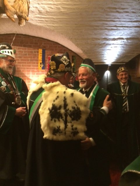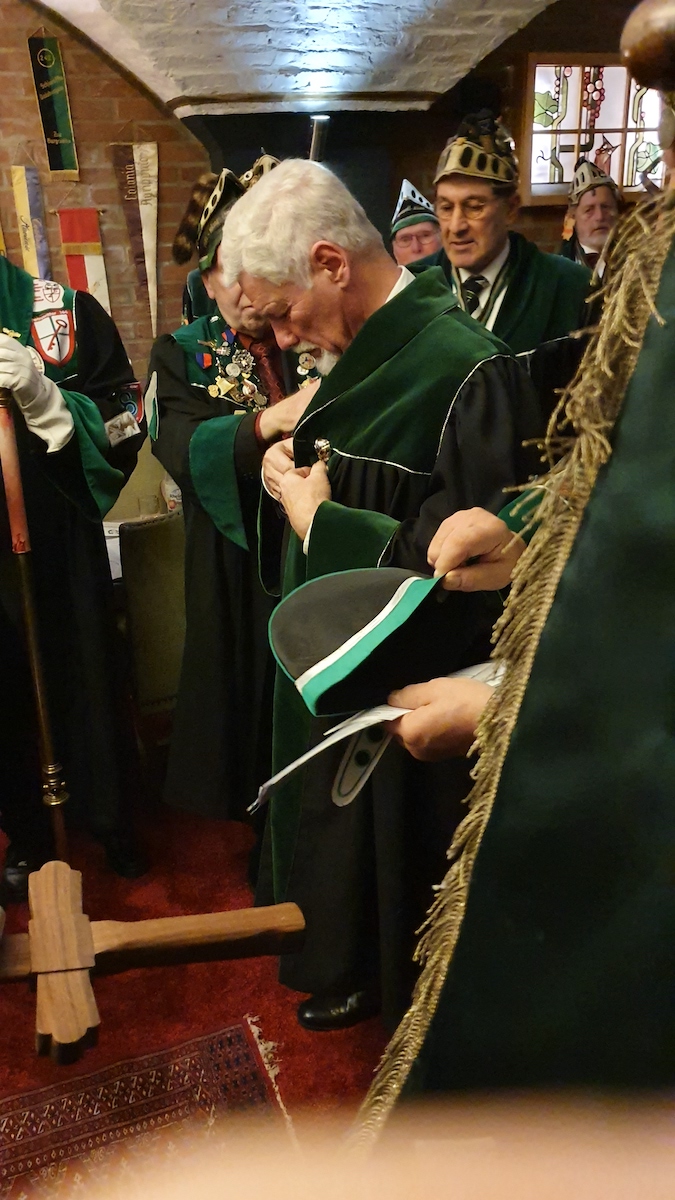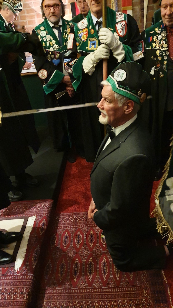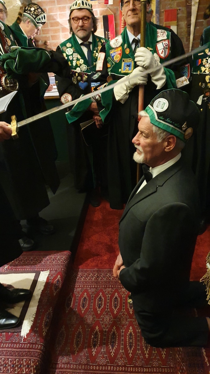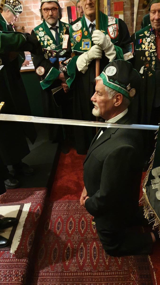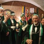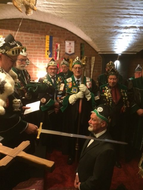 Am 30. im Eismond a.U. 161 war es dann soweit, unser Jk Rainer wurde mit allem Pomp und Ceremoniale feyerlich in den Ritterstand erhoben. 48 Sassen bildeten einen farbenprächtigen Rahmen für diesen Ritterschlag, dem ein gar exzellentes Liebesmahl vorweg ging und eine feucht fröhliche Kristalline nachfolgte.